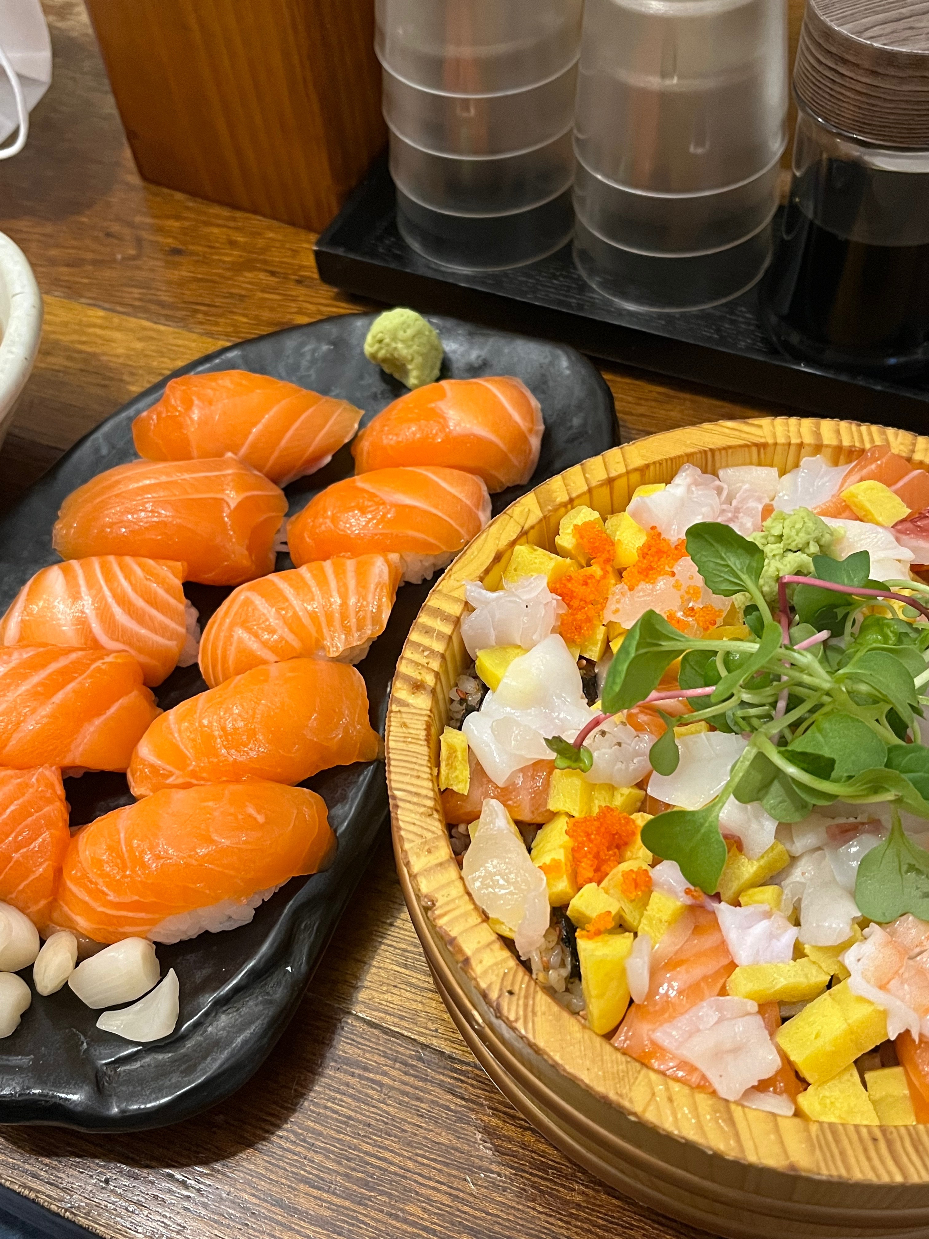맛있고 담백한 연어 초밥과 연어 샐러드는