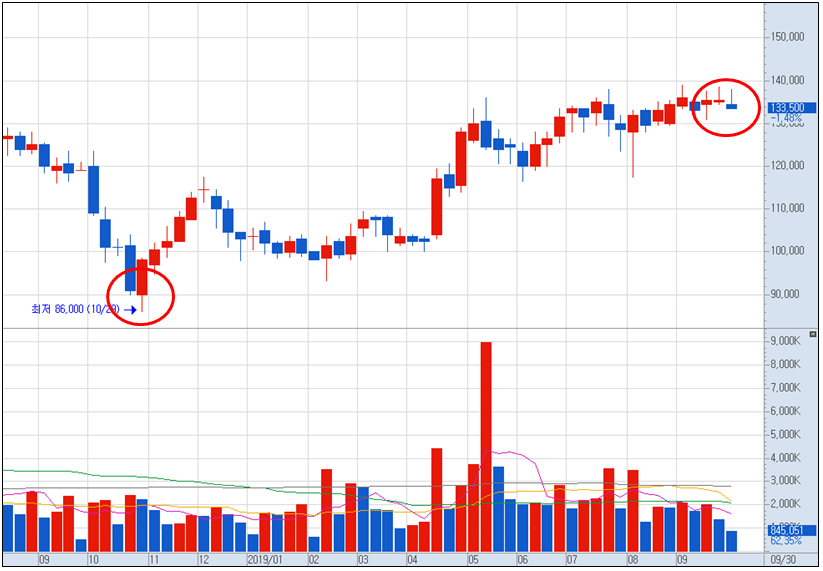 자 봅시다. 8만 6천에 처음 상승했을 때 12만 원까지 상승 후 저항 맞고 조정받은 뒤 현재 14만 원대에서 놀고 있네요. (물론 지금 사라는 건 아닙니다.)