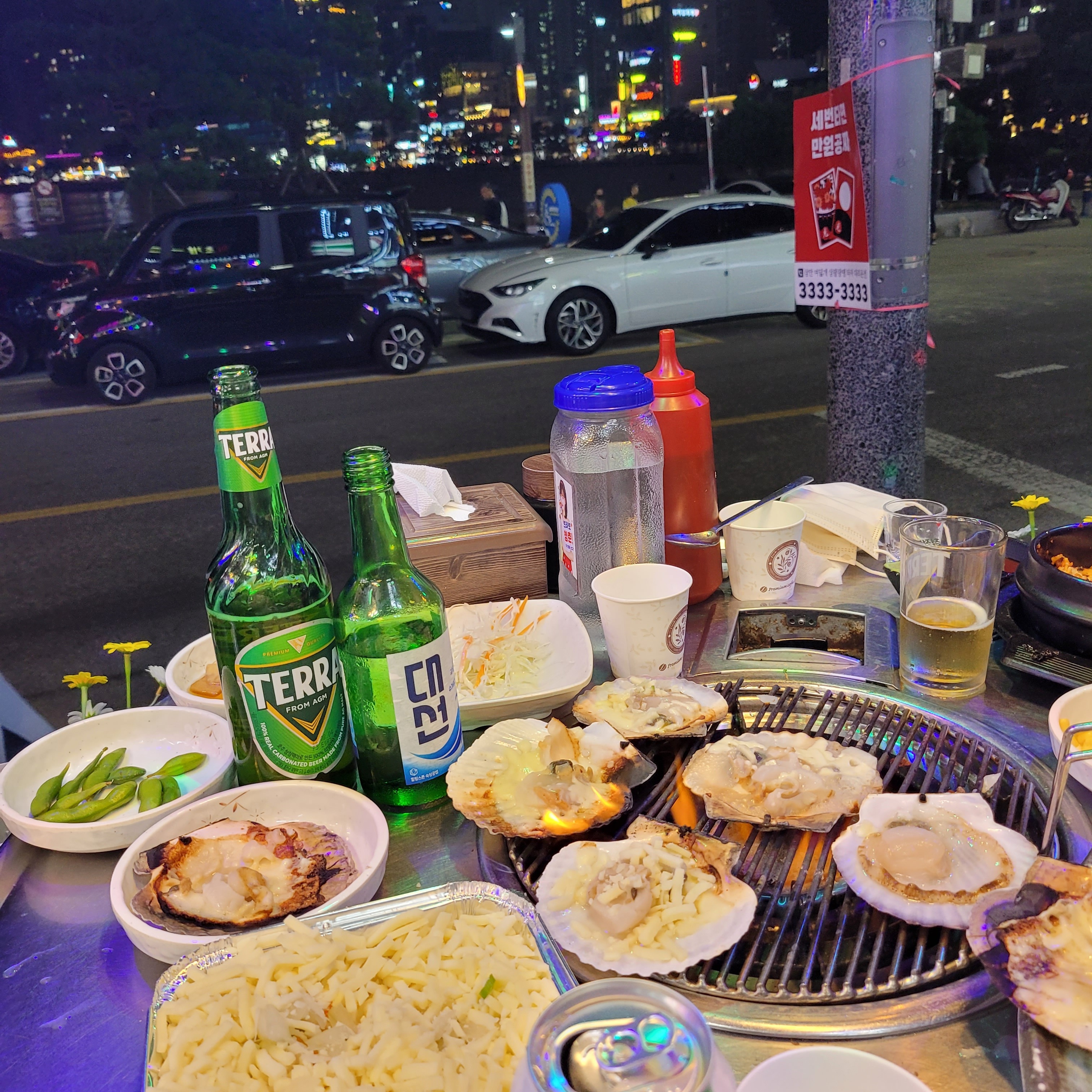 조개 구워지는 소리와 광안리 해수욕장의 파도 소리가 어우러지며