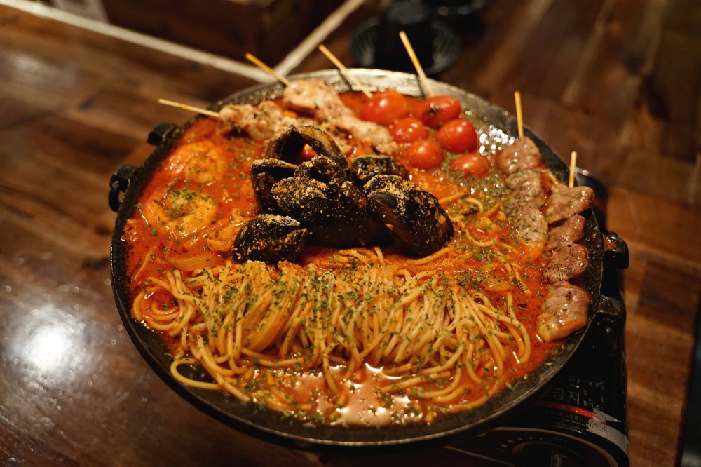 독특한 소스 베이스에 파스타와 꼬치구이 새우와 홍합등 신선한 재료가 다 때려들어간