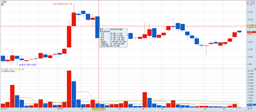 위 종목은 대북주의 비료 관련 테마주 중 대장주인 경농이라는 종목입니다.