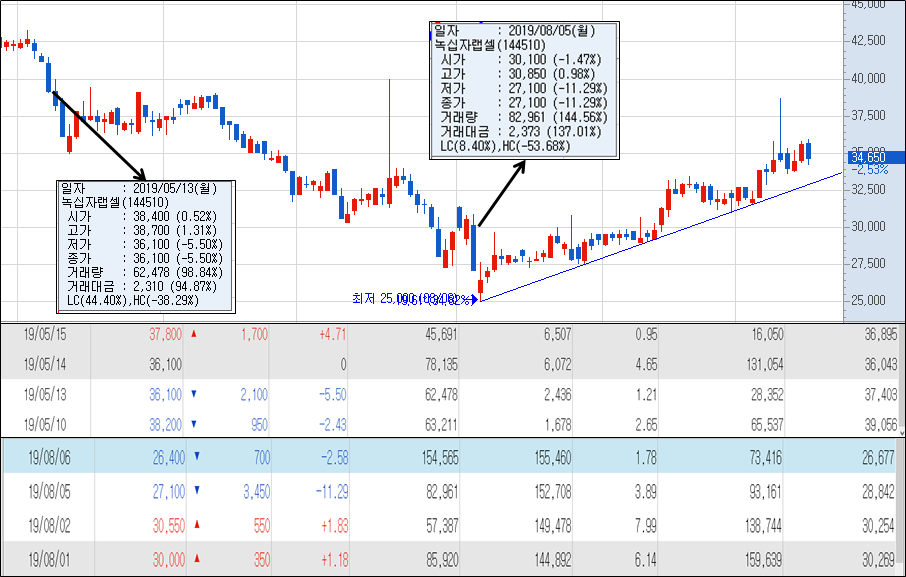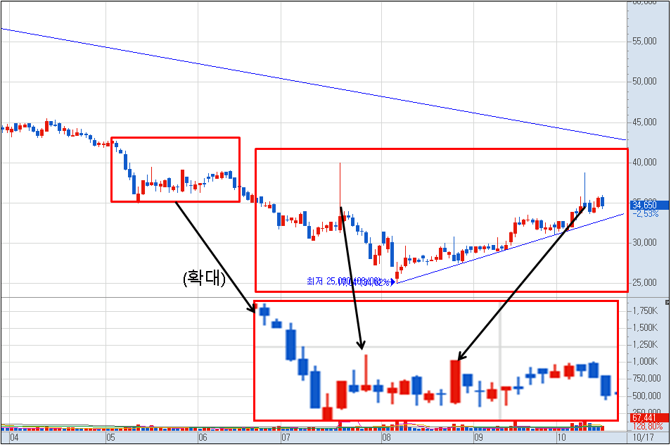 그냥 저 날에 샀으면 25,000 원에서 38,000 원까지 52% 의 수익을 볼 수 있었단 말입니다.