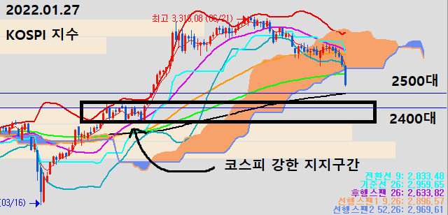 - 코스피 지수의 경우 현재 강한 하락세를 보여주고 있으며 현재 구간에서 조금 더 하단인 2500대 구간부터 지지 구간이 시작 됩니다.