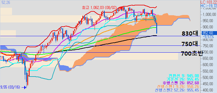 전 세계 시장이 좋지 않은 관계로 신규 진입 혹은 물타기를 진행하실 경우 2회~3회 분할로 700~830대 구간에 나눠서 진입하시는 것을 추천드립니다.