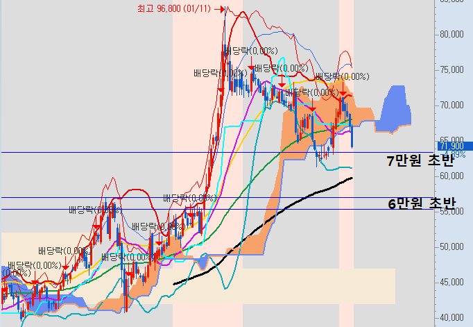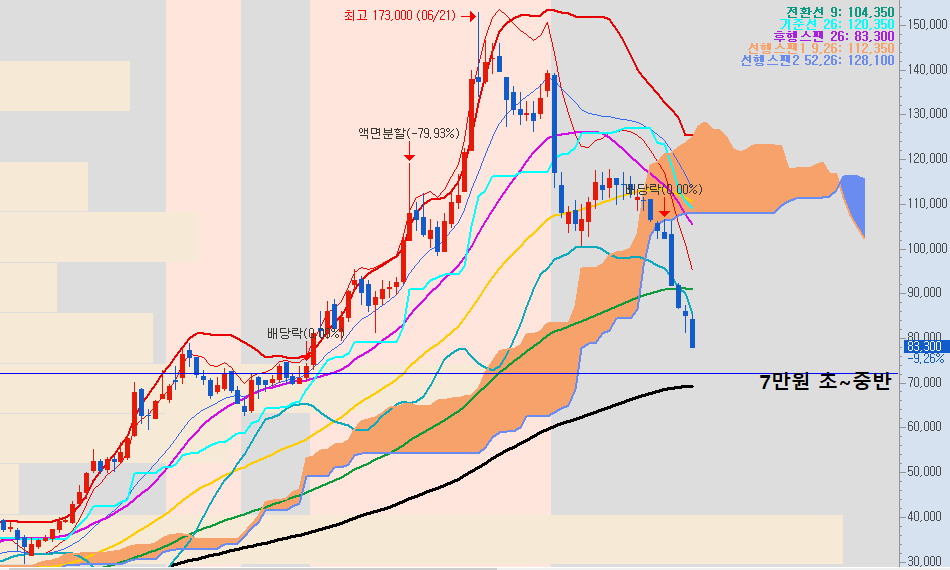 현재 구간에서 지지를 잡아주면 좋겠지만 7만원 초반 1차 지지구간이 무너질 경우 6만원 초반 구간까지 하락세가 현출 될 염려가 있습니다.