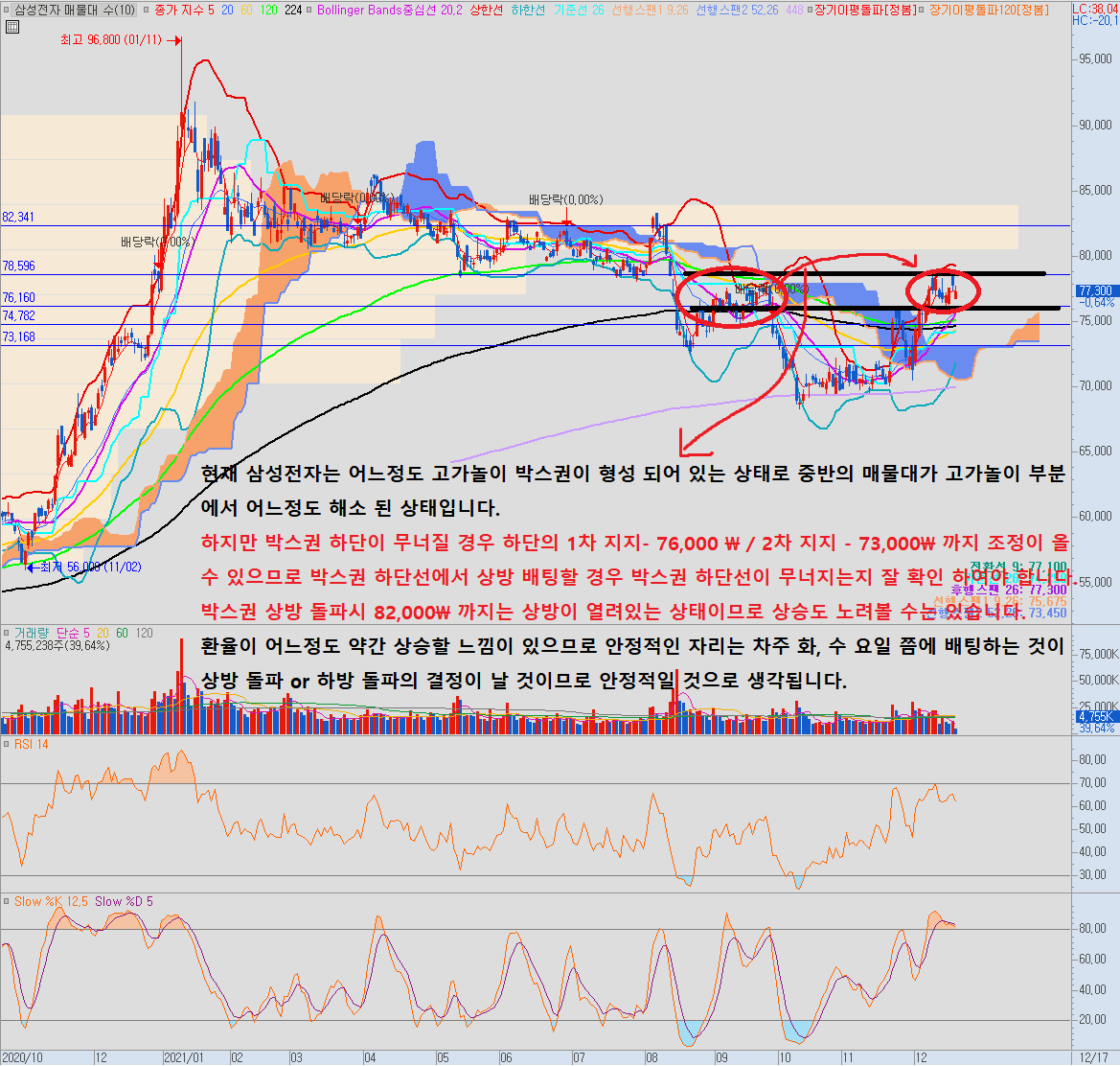 하지만 박스권 하단(검은색 두꺼운선)이 무너질 경우 하단의 1차 지지 - 76,000\ / 2차 지지 - 73,000\ 까지 조정이 올수 있으므로 박스권 하단선에서 눌림목 상방 배팅할 경우 박스권 하단선이 무너지는지 잘 확인 하여야 합니다.