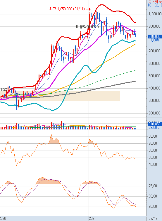 코스피 지수가 힘을 받을 경우 어느정도 상승의 방향을 함께하나 78만원 구간 (1차) / 65만 (2차) 구간까지는 조정이 이루어질 수 있다.