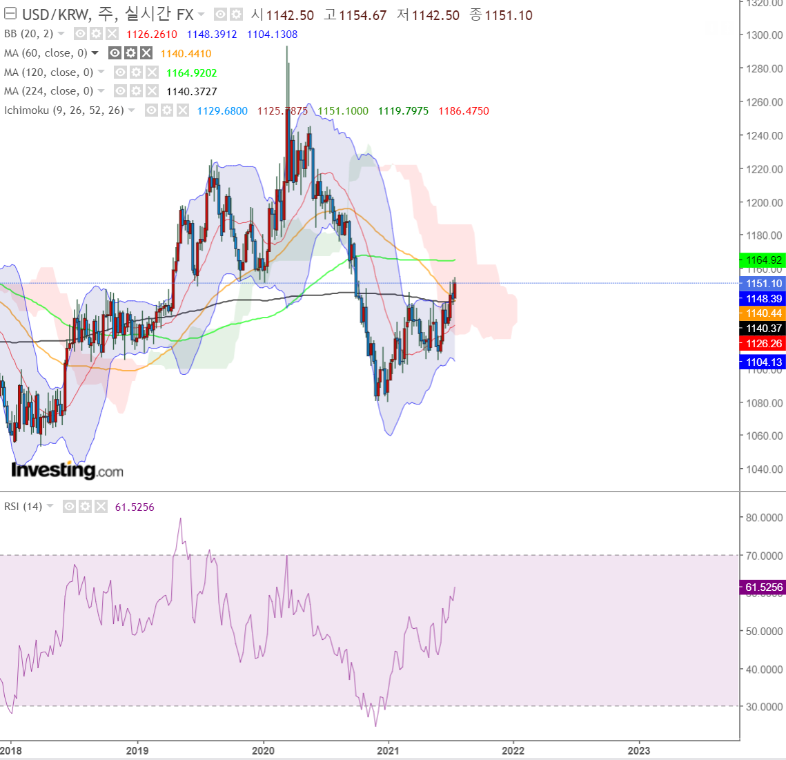 음운에 돌입하여 상승이 이루어지고 있으나 환율 1160 원 정도에 상승을 맞을 시 상단의 매물 저항 구간에