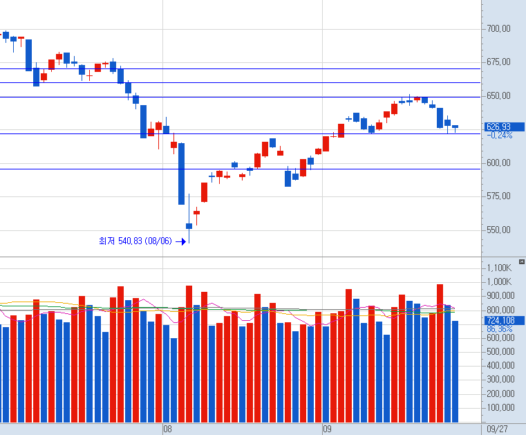 코스닥의 경우 약한 하락을 맞이하며 지지선을 지켜주는 움직임을 보여주고 있는데요.