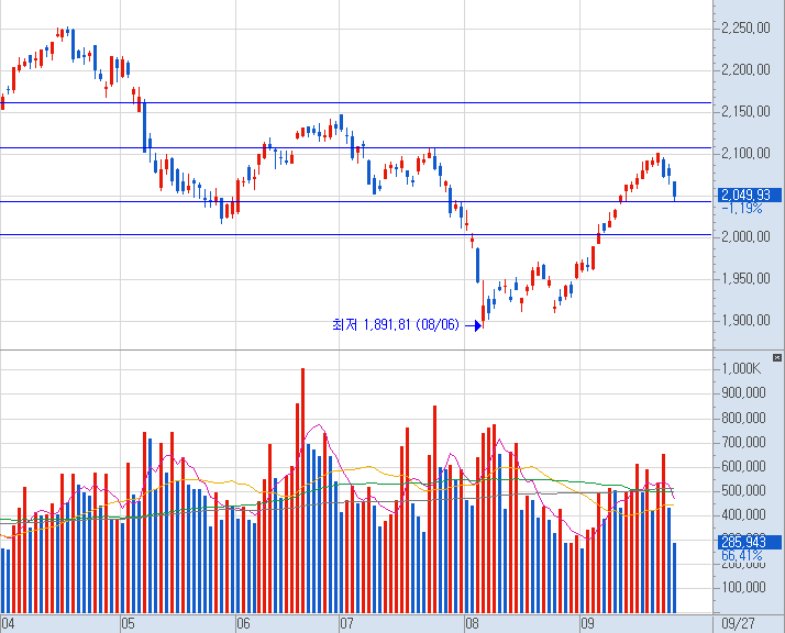 코스피는 이전 지수분석에서 예견한대로 코스닥보다 더 큰 하락세를 보이고 있네요.