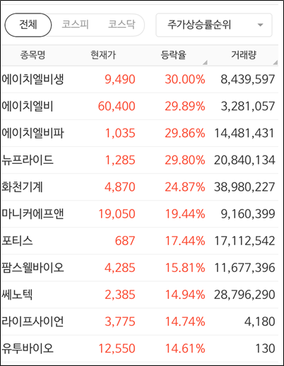 20%이상 상승 종목이 그래도 저번주 금요일보단 좀 나은장이었네요.