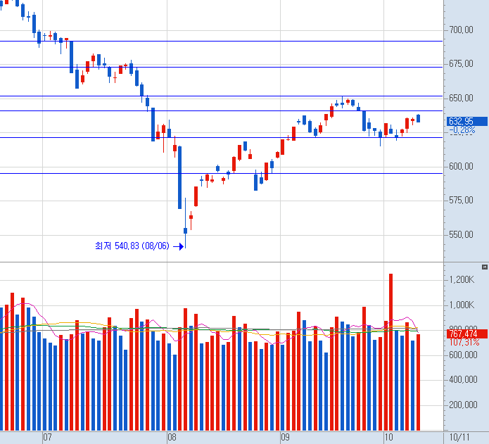 코스닥 지수는 그동안 약간 강한 상승 후 가격대를 지켜주는 움직임만 보이고 오늘은 크게 다이내믹한