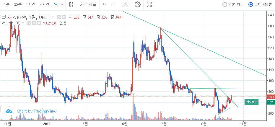 현재 지니는 리플 종목의 저점 구간에 주로 매수하여 들고 있다 보니... 평단이 321원이네요 ㅎㅎ
