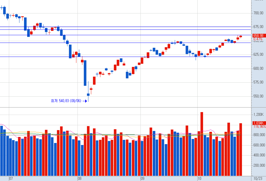 아직도 코스닥은 상승의 여력이 남아있으므로 좀 더 지켜봐야 하겠습니다.