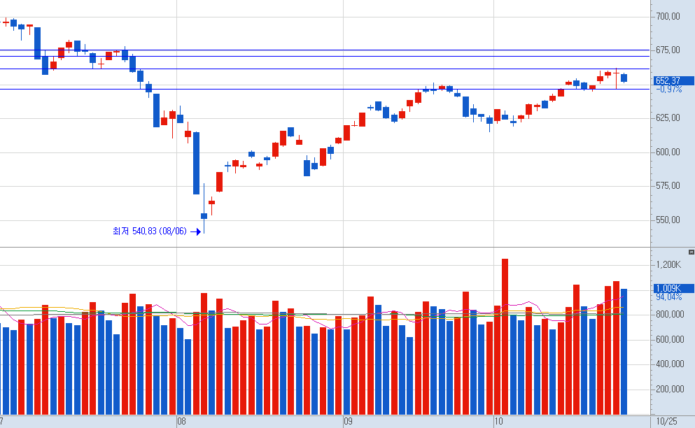 코스닥 지수는 아직 큰 움직임 없이 박스권내 조정을 받는 장이었네요.