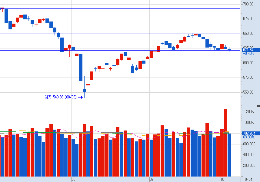 때문에 코스피가 무너져서 급락 할 경우 코스닥 역시 590대의 지지선을 확인할 수 있습니다.