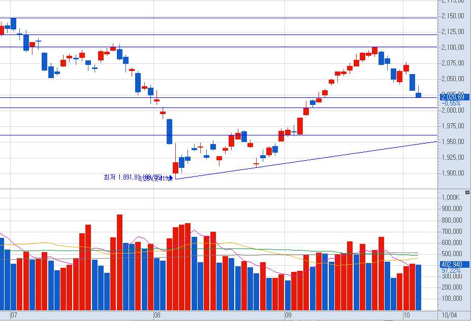 월요일에 저 지지선이 깨지는 순간 2000대 지지 여부를 지켜봐야 할 것이라 말이죠.