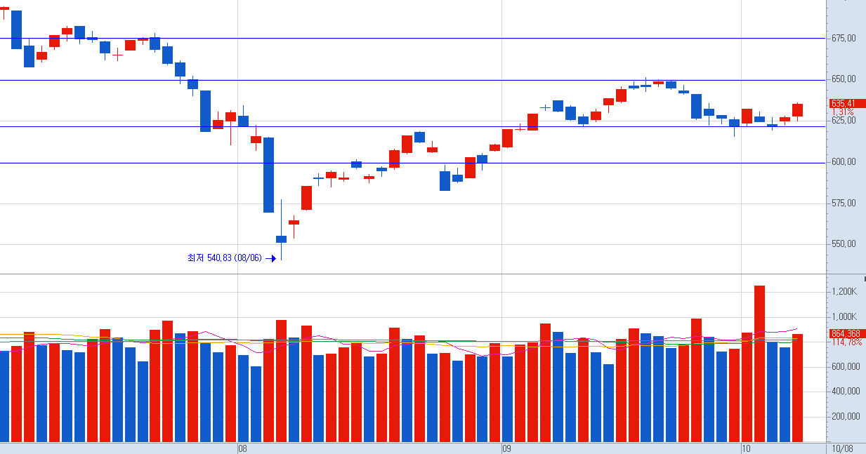 650선까지는 가줄 것 같은걸 봐서는 코스피도 예상대로 2050~60 박스권 상단까지 무난히 갈듯합니다.