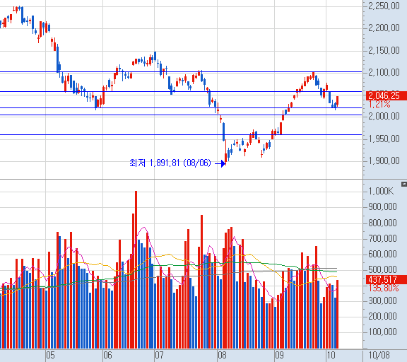 2050~60의 상단 박스권을 이탈하지 않는 이상 2000선의 지지선을 확인하게 될 것이란 생각은 변함이 없습니다.